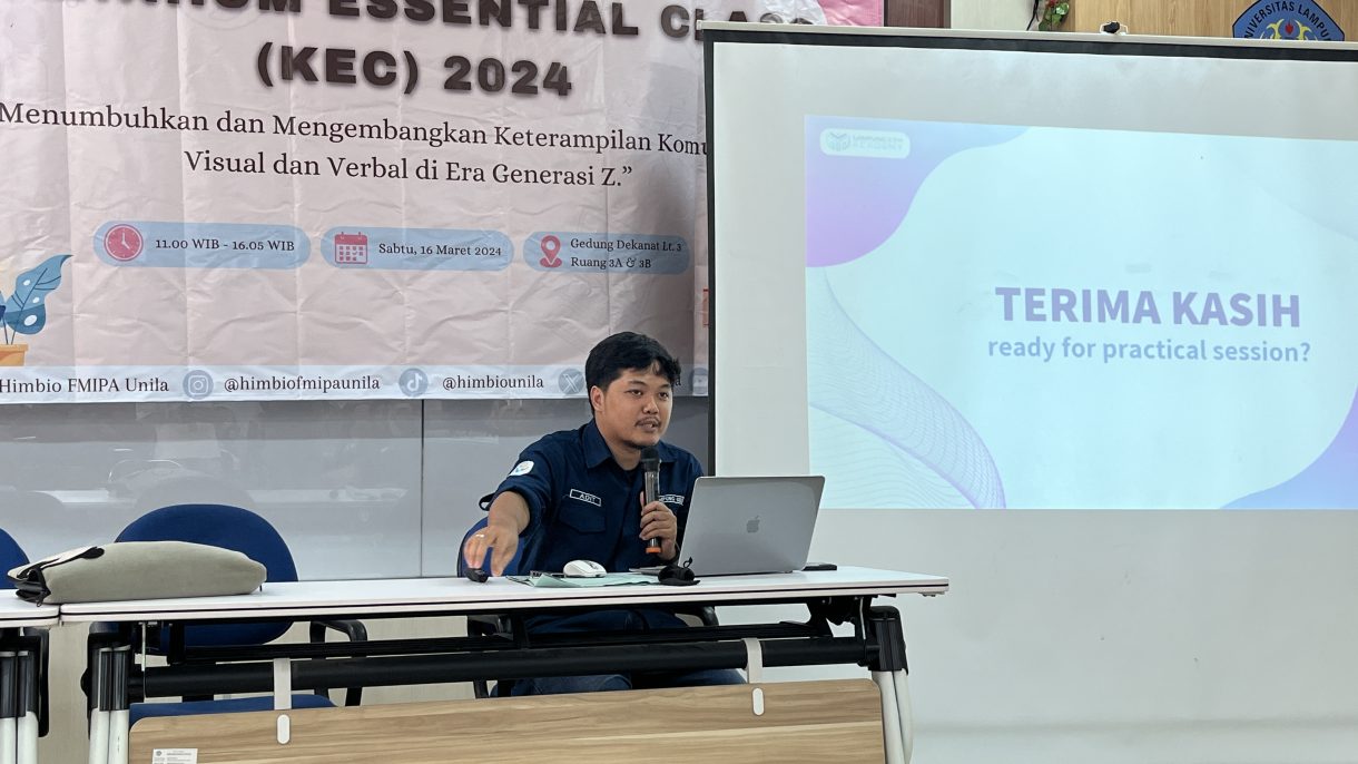 Kominhum Essential Class (KEC) 2024 merupakan event yang diselenggarakan oleh Himpunan Mahasiswa Jurusan Biologi Universitas Lampung (Himbio Unila), kegiatan yang berbentuk pelatihan ini bertujuan sebagai wadah pengembangan minat dan bakat pengurus HIMBIO FMIPA Unila dalam pembuatan poster ilmiah melalui aplikasi Canva dengan baik dan benar, meningkatkan rasa percaya diri, serta kemampuan untuk membuat suatu poster ilmiah yang menarik pada platform media social HIMBIO FMIPA Unila. Diharapkan para pengurus HIMBIO FMIPA Unila dapat mengembangkan potensi dan keahlian dalam bidang public speaking dan desain grafis.